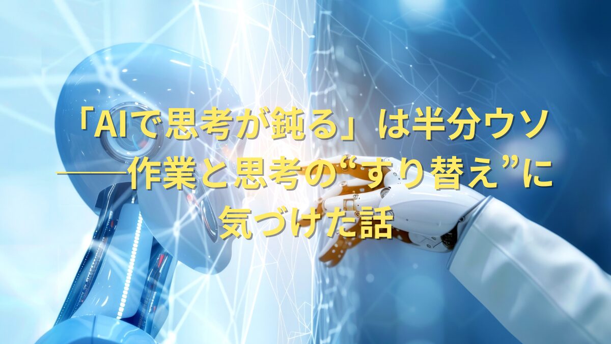 マインド 「AIで思考が鈍る」は半分ウソ──作業と思考の“すり替え”に気づけた話 「AIばかり使ってると、考える力が落ちるよ」たしかに、そう思っていた時期がありました。特にChatGPTが普及し始めた頃。何でも答えてくれるツールに触れて、僕も最初は驚きました。そして同時に、怖くもなったんです。「これは便利すぎる。このまま... 2025.09.18 マインド