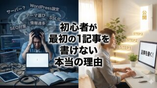 マインド 初心者が最初の1記事を書けない本当の理由 「ブログを始めよう!」そう決めたあの日から、どれだけ時間が経ったでしょうか。・サーバーはどれが正解なんだろう・WordPressって、何から始めればいいの?・テーマ選びって、どう決めるのが正解?・SSL化って何?独自ドメインって必要?調べる... 2025.12.06 マインド