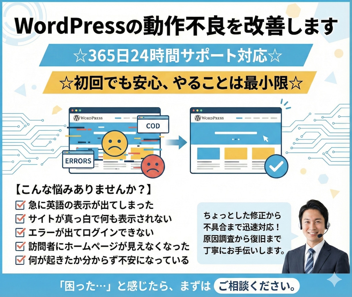 WordPressの内部トラブルまではカバーしてくれないケースがほとんどです。